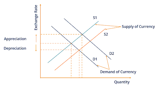 فإذا ازداد الطلب على العملة المحلية بسبب ارتفاع الصادرات أو تدفقات الاستثمار، ترتفع قيمتها، أما إذا قلّ الطلب بسبب ضعف الاقتصاد أو زيادة الاستيراد، تنخفض قيمتها.